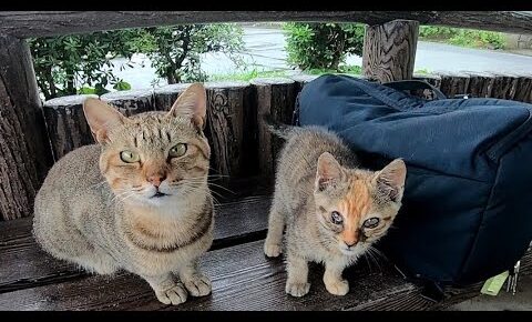 猫島にある公園の東屋でお母さん猫とその子供の猫が雨宿りをしていました。主さんがベンチへ近づくとお母さん猫は興味津々な表情で立ち上がります。