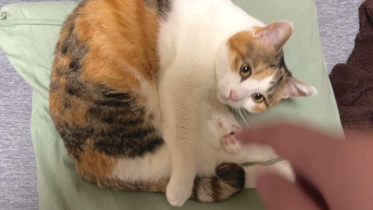 最初は寝ぼけていた猫も、指を突っ込まれて一瞬、え?という顔をしていましたが、すぐにうっとりとした表情に。嫌がる素振りは一切見せず、むしろ心地よさそうにその手を受け入れます。