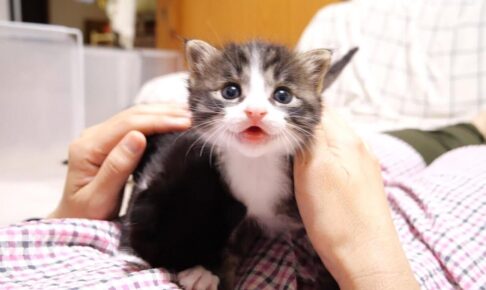 保護猫の子猫のユメちゃんがお母さんにお風呂に入れてもらって汚れてしまったおしりを綺麗に洗ってもらっています。