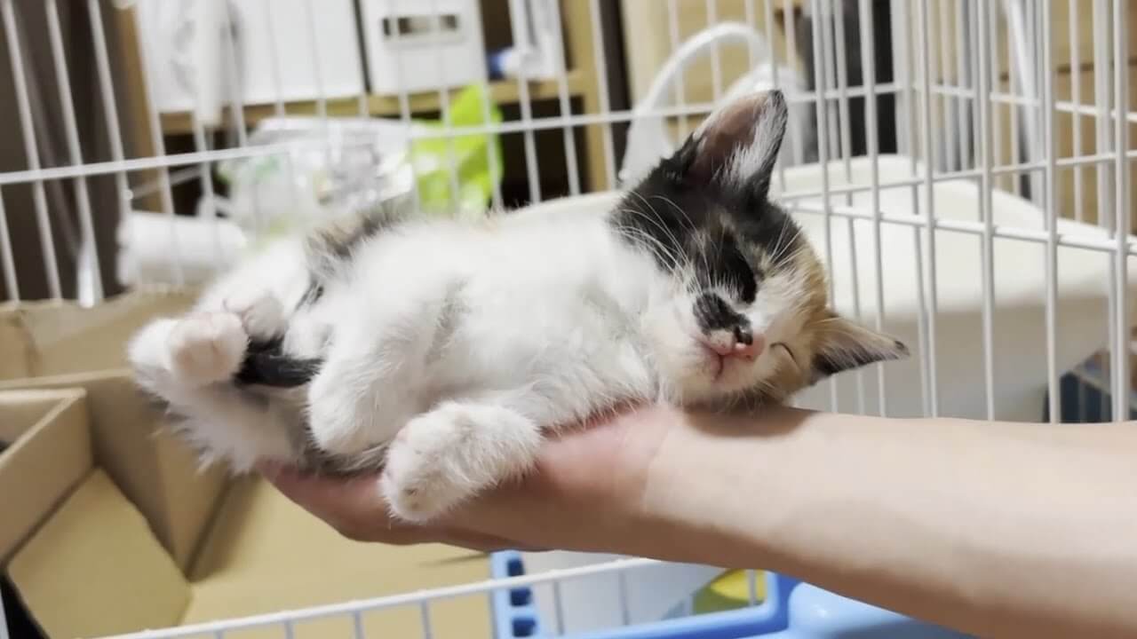 三毛の子猫を手のひらで包んであげていると、そのまま寝落ちしてしまいました。背後にいるキジトラ猫も座ったままで、目を閉じはじめ今にも寝落ちしそうな感じです。