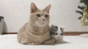 いつもおとな猫のそばにくっついている子猫豆大福が可愛い