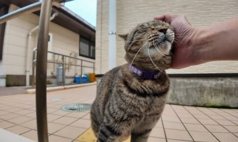 住宅街でキジトラ猫さんに出会います。主さんの姿をみるとすぐにそばまでやってきました。頭をグリグリと擦り付けてごあいさつをちゃんとしてくれました。