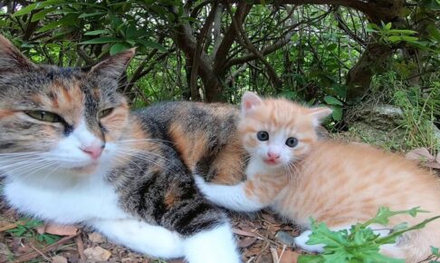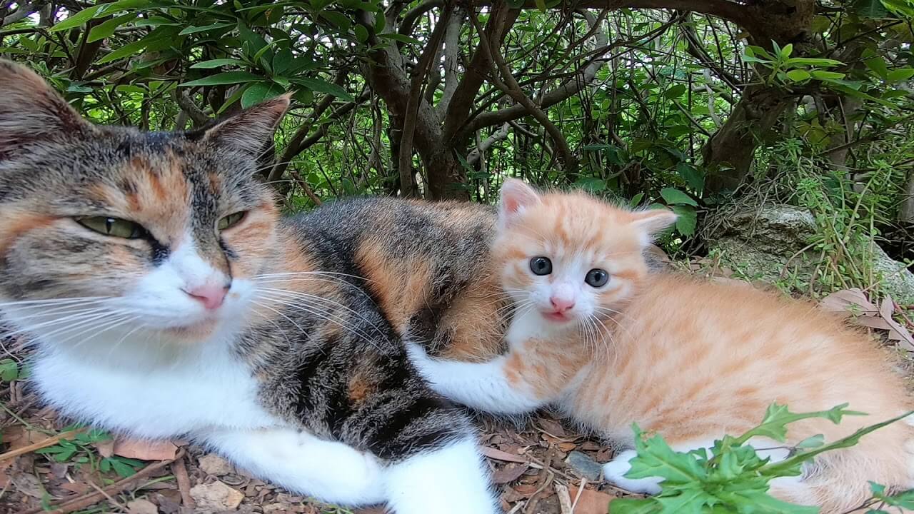 お母さん猫が大丈夫よ〜と子猫に声をかけていますが、子猫のほうはかなり緊張している様子がうかがえます。