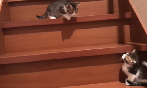 子猫にとっては、この階段の高さは恐怖以外のなにものでもありません。階段を登って上の階へ行ってみたいけれど、怖くて登れないというジレンマに悩まされているようです。