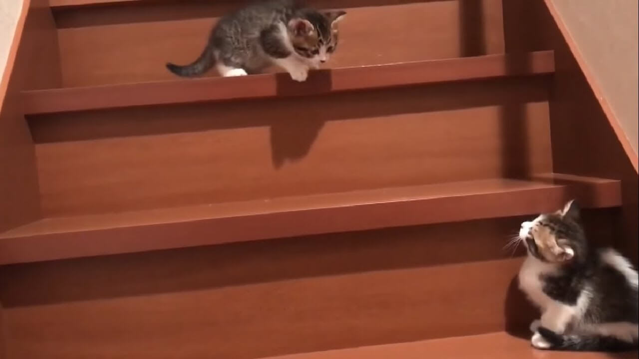 階段登りにチャレンジする勇敢な子猫