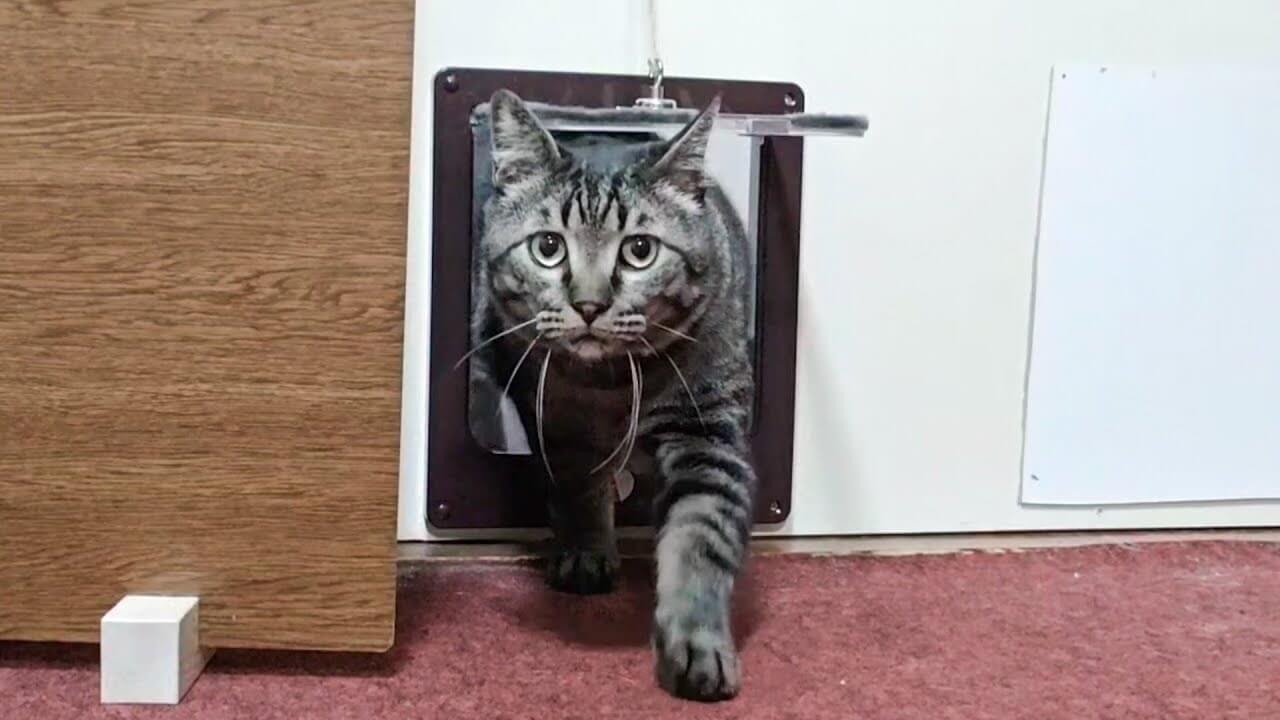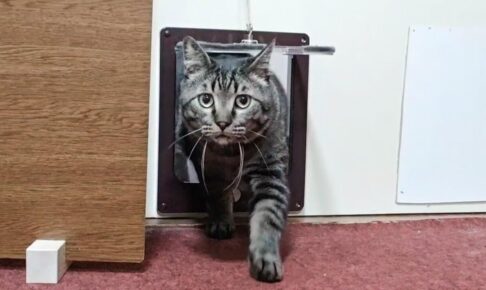 慣れた様子で猫ドアから入ってきてお客さんである主さんのことを歓迎してくれました。ご挨拶が終わると部屋からいそいそと出ていきます。