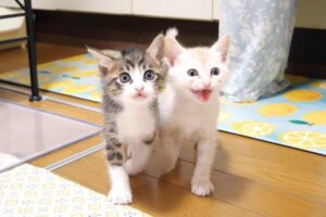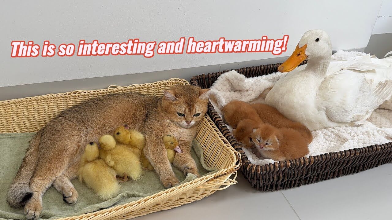 寝床にはお母さん猫を待つ赤ちゃん猫たちの姿がありました。お母さん猫が子猫たちの世話を始めると、アヒルの子たちもその周りに集まり、さらには子猫たちのカゴの中へ。