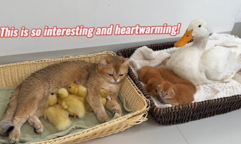 お母さん猫は自分の子猫だけでなく、アヒルの子たちも優しく舐めてあげます。そこに大人のアヒルもやってきて、アヒルの子たちと子猫たちをじっと見守ります。