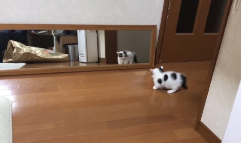 飼い主さんは部屋に横長の鏡を置いてみました。