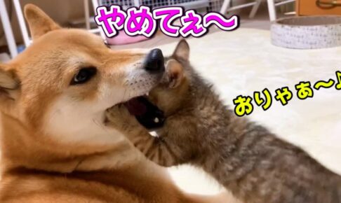 その点、子猫の扱いがうまいのは柴犬のリコです。上手にリタのことを遊ばせてあげています。一番遊んでくれるリコのことをお母さん猫のように慕っているリタなのでした。