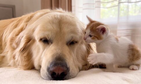 昼寝中のゴールデンを邪魔する小悪魔な子猫
