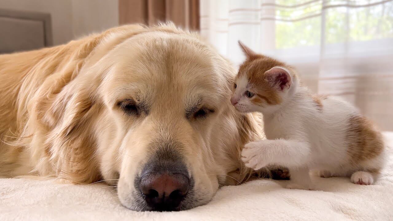 静かにお昼寝を楽しもうとしていたゴールデンレトリバーでしたが、子猫が邪魔をしてくるのでうかうか眠ることもできなくなってしまったようです。