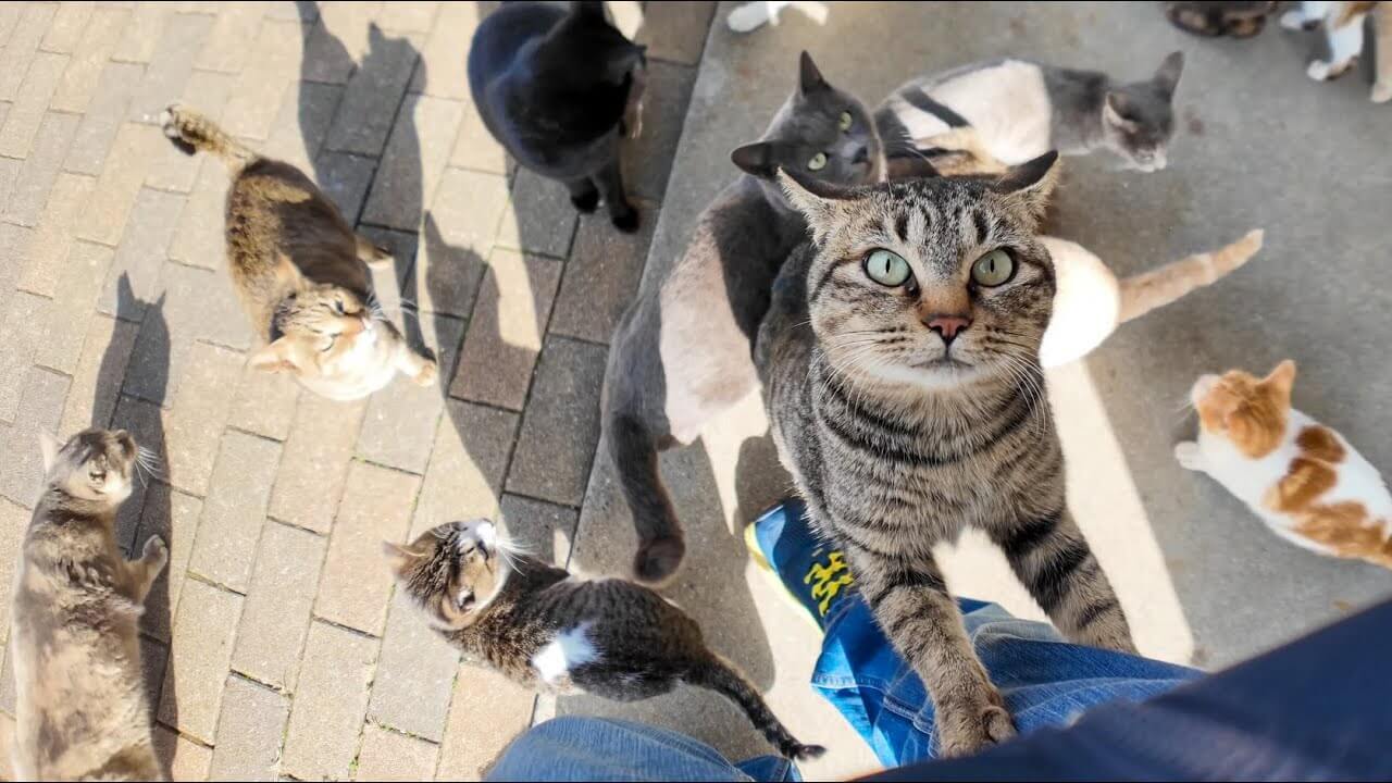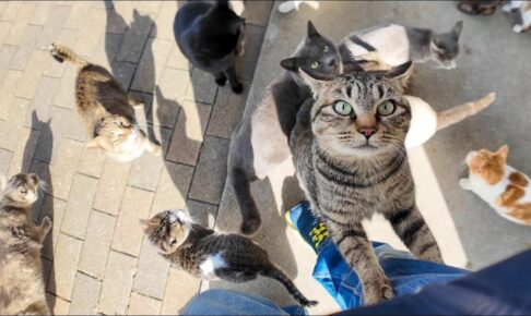 主さんが猫島の小さな商店で菓子パンを購入してお店の外にでてみたら!なんとお店の前はおびただしい数の猫さんたちが集まってきていました。