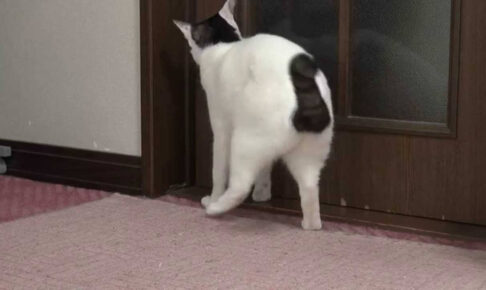 そして二つ目は猫さんが急いでドアを開けたい時の方法です。すぐに開けたいときはドアの前で立ち上がり前足をサッと差し込んでカラカラとドアを開いています。