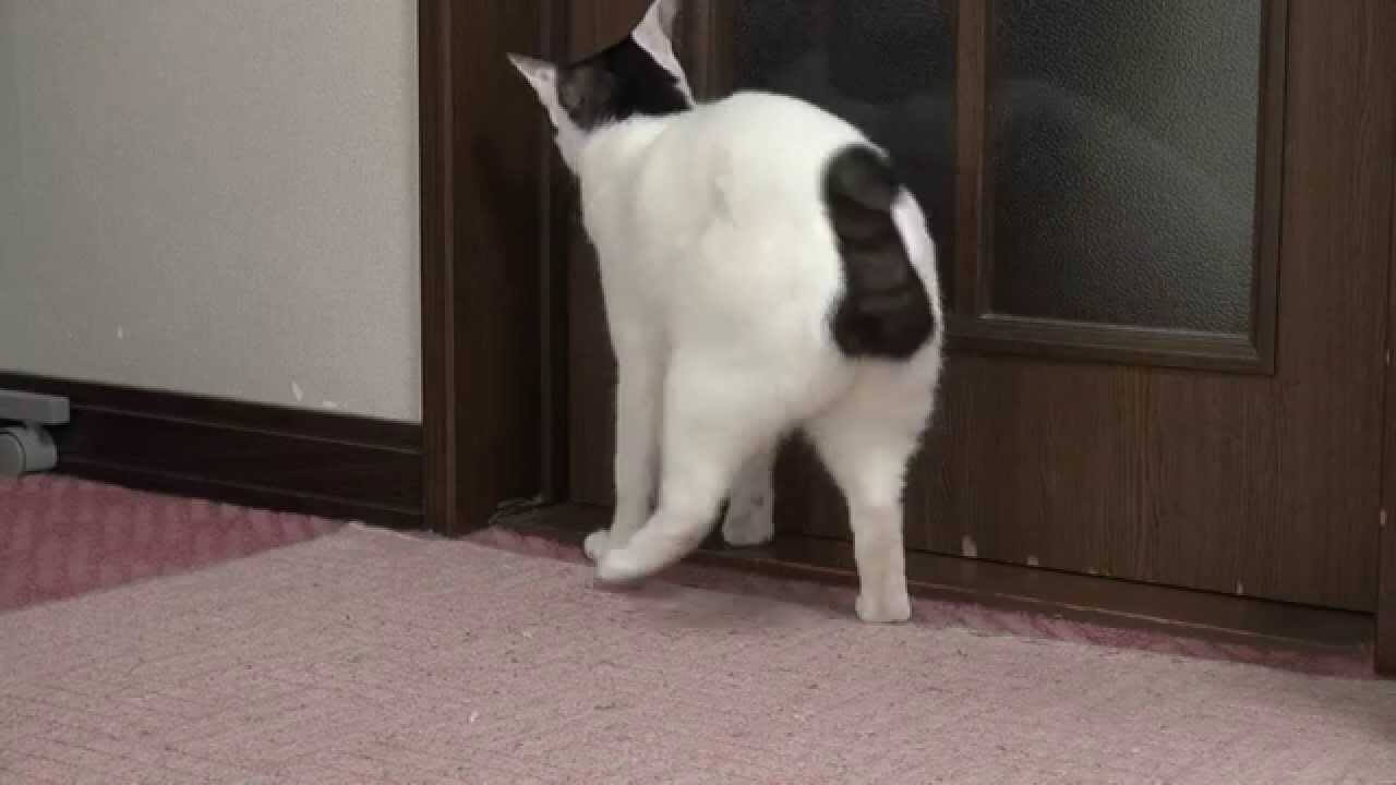 なんと猫さんは低めのジャンプをして勢いをつけながら後ろ足でドアをキックしてその反動でドアが開くという絶妙なプロの技を見せてくれます。