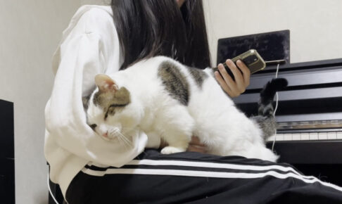 その証拠に、違う日に、豆大福はひのきと同じような行動をします。おねえちゃんの膝の上に飛び乗って甘え始めたのです。なんでもひのきの真似をしたがる末っ子の豆大福が可愛いですね。