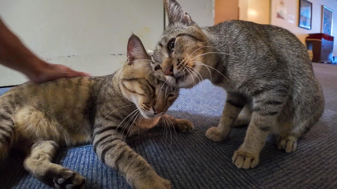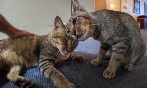 キジトラ猫さんのことをたっぷり撫で回してあげていると他の猫さんもやってきて、自分も撫でてもらいたいようなおねだりの表情を見せています。