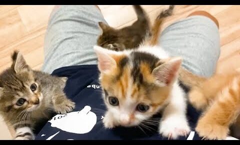 床に降りるとあっという間に子猫たちに囲まれてしまう主さんです。子猫たちのパワーには主さんもタジタジのようですね。
