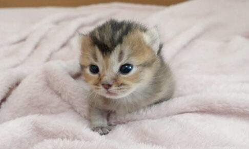 ピンクの柔らかな毛布の上を、まだおぼつかない足取りでよちよちと歩きながら、時折か細い声でおかあさん猫を呼ぶ姿は、こころから守ってあげたくなるほどの愛らしさです。