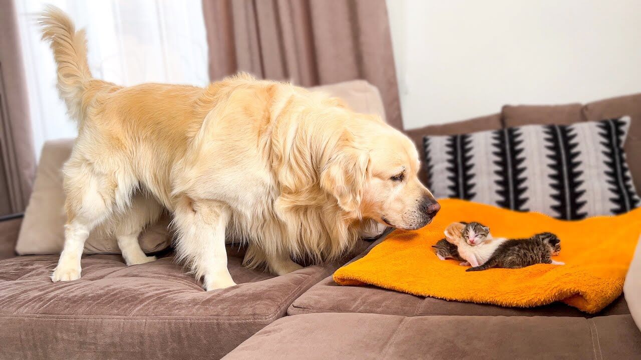 ゴールデンレトリバーのワンコがソファの上でひとかたまりになっている赤ちゃん猫たちの匂いを盛んに嗅いでいます。