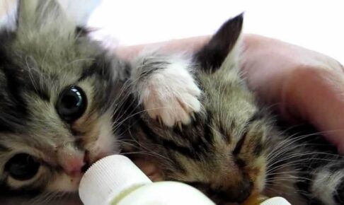 1匹は固く目をつぶってぐっすりと眠っているようですが、もう1匹の子猫のほうは美味しそうにミルクを哺乳瓶からグビグビと飲み干していきます。