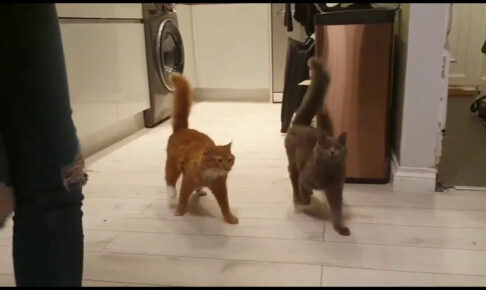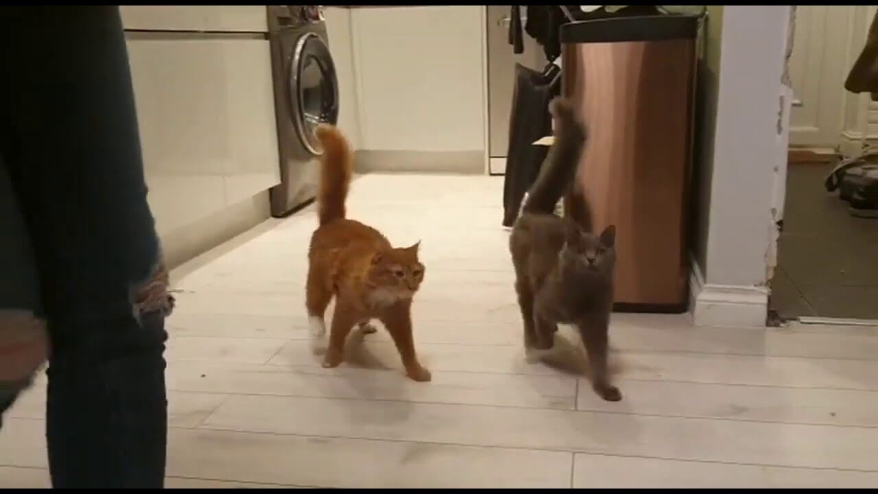 この二匹の猫たちは兄弟のようで、どちらも脳に障害があるのかもしれません。それにしても2匹とも全く同じ歩き方になっているのはとても不思議です。