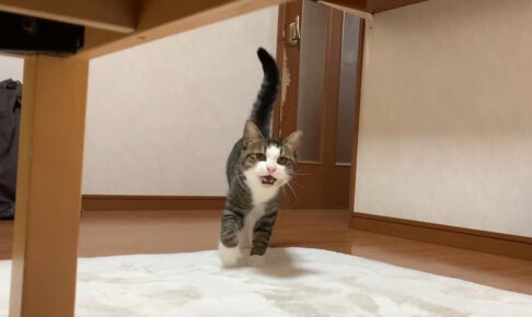 飼い主さんが猫のオデコの名前を呼ぶと、奥の部屋から可愛らしい声で返事をしながらキジ白猫のオデコちゃんが登場します。