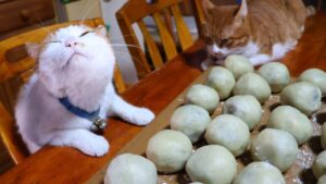 春彼岸のまんじゅう作りを手伝うにゃんこたち