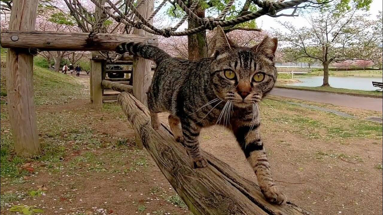途中にアスレチックの器具があっても、キジトラ猫ちゃんは撮影者さんのところへ。