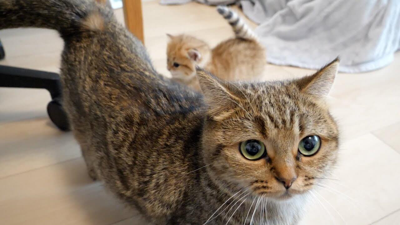 子猫があまりに可愛いので、撮影をしようとしますが、なぜかお母さん、猫がすぐにやってきて、邪魔をしようとします。