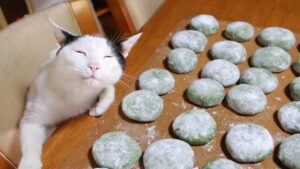 お婆ちゃんの草餅作りに付き合う猫達