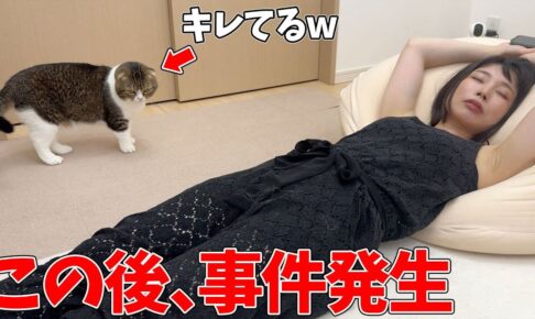 飼い主さんはちょうどお昼寝をしている最中のようです。ぽこ太郎は爆睡しているママに対して、なんとか起きてくれないかという念を込めたビームを送っていたのですね。