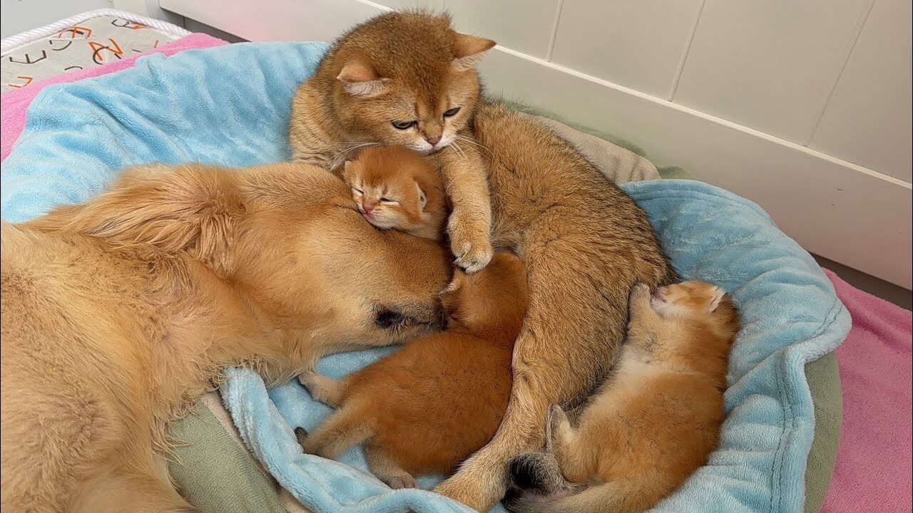 子猫たちと初対面のゴールデンのワンコの幸せそうな表情にホッコリします