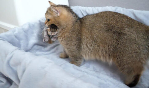どうやら可愛い我が子を勝手に体重測定されてご機嫌斜めになってしまったのか、赤ちゃん猫たちをキャットタワーのほうへお引越ししはじめてしまいました。
