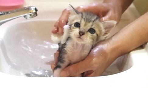 お母さんはトワをエプロンのポケットからそーっと抱き上げて洗面台へ。トワは最初は少し驚いた様子でしたが、温かいお湯にすぐに慣れ、とてもおとなしくしています。