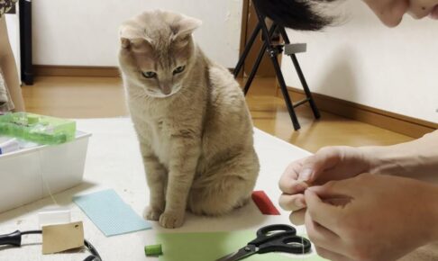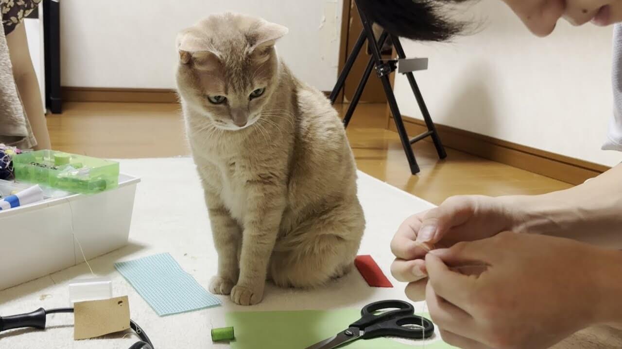 家庭科の宿題ということでハサミを使ったりしているんですが、そこが猫ちゃん的には心配なのでしょう。