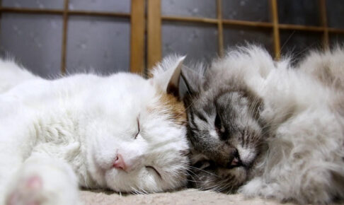 一方で、しろさんのほうはぎゅっと目をつぶってぐっすりと眠っています。ところが、しろさんがいきなりムクっと上半身を起こしてしまいました。