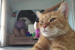 2匹の猫さんが仲良く頭をくっつけてまったりしています。お互いの頭のてっぺんとてっぺんとぴったりとくっつけて仲良しっぷりをアピールしているようです。