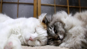 頭と頭をぴったりくっつけてまったりする2ニャンズ