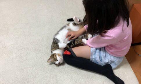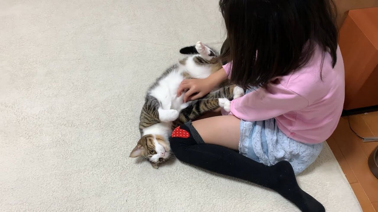娘ちゃんに撫で撫でしてもらって嬉しそうに寝転がってコロンコロンしているおでこがとても可愛いです。おでこが娘ちゃんに向ける眼差しには、強い信頼感が見て取れますね。