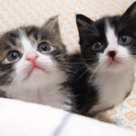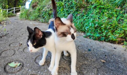 風の強い日に坂道の途中でハチワレ猫さんと美しいブルーの目をしたタヌキ顔の猫さんが仲良くお互いの頭をスリスリさせながら佇んでいました。