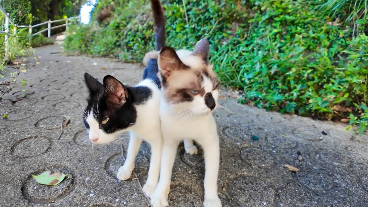 お互いを身体をスリスリさせながらあとをついてくる猫のカップル