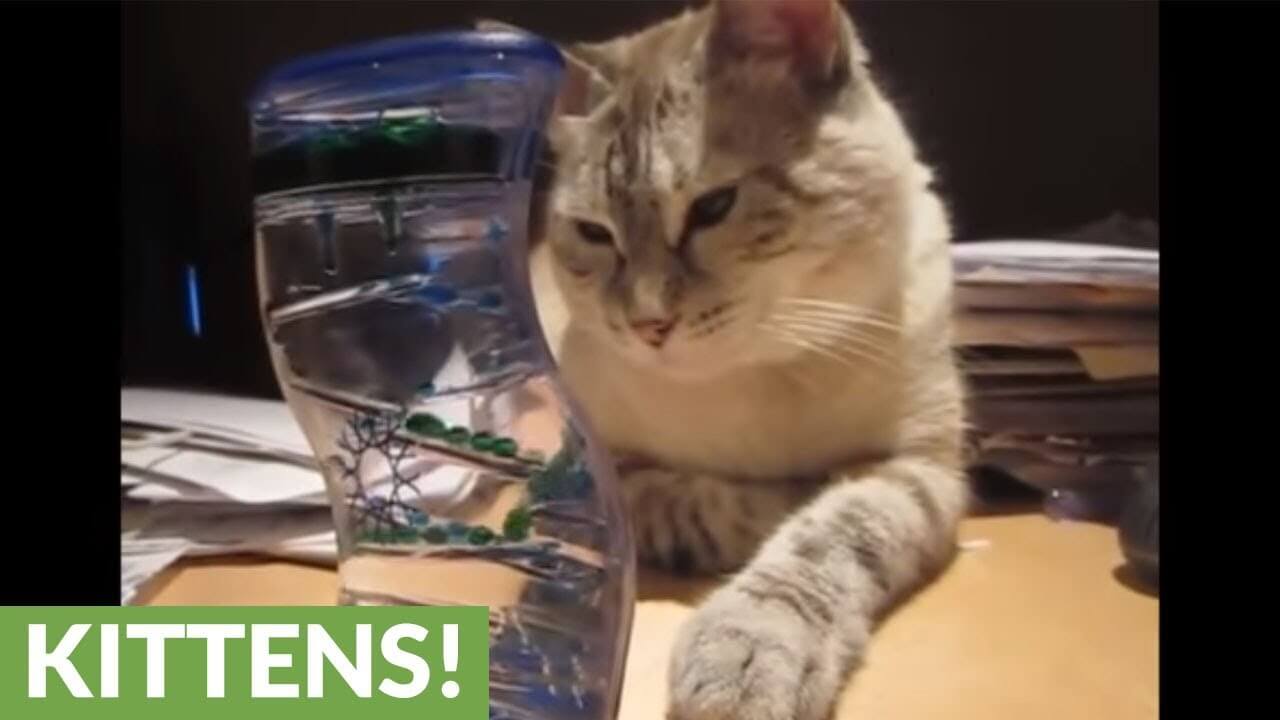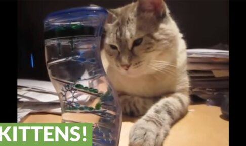 グリーンのオイルがコロコロ転がりながら落ちていくオイルタイマーに釘付けになっている可愛いシャム系の猫さんです。