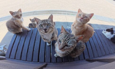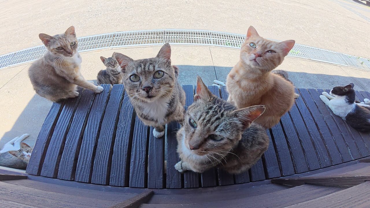 ふと窓越しに外を見てみると、なんと窓の下にはたくさんの猫さんたちが大集合していました。みんな揃って可愛いお顔で窓のほうを見上げています。