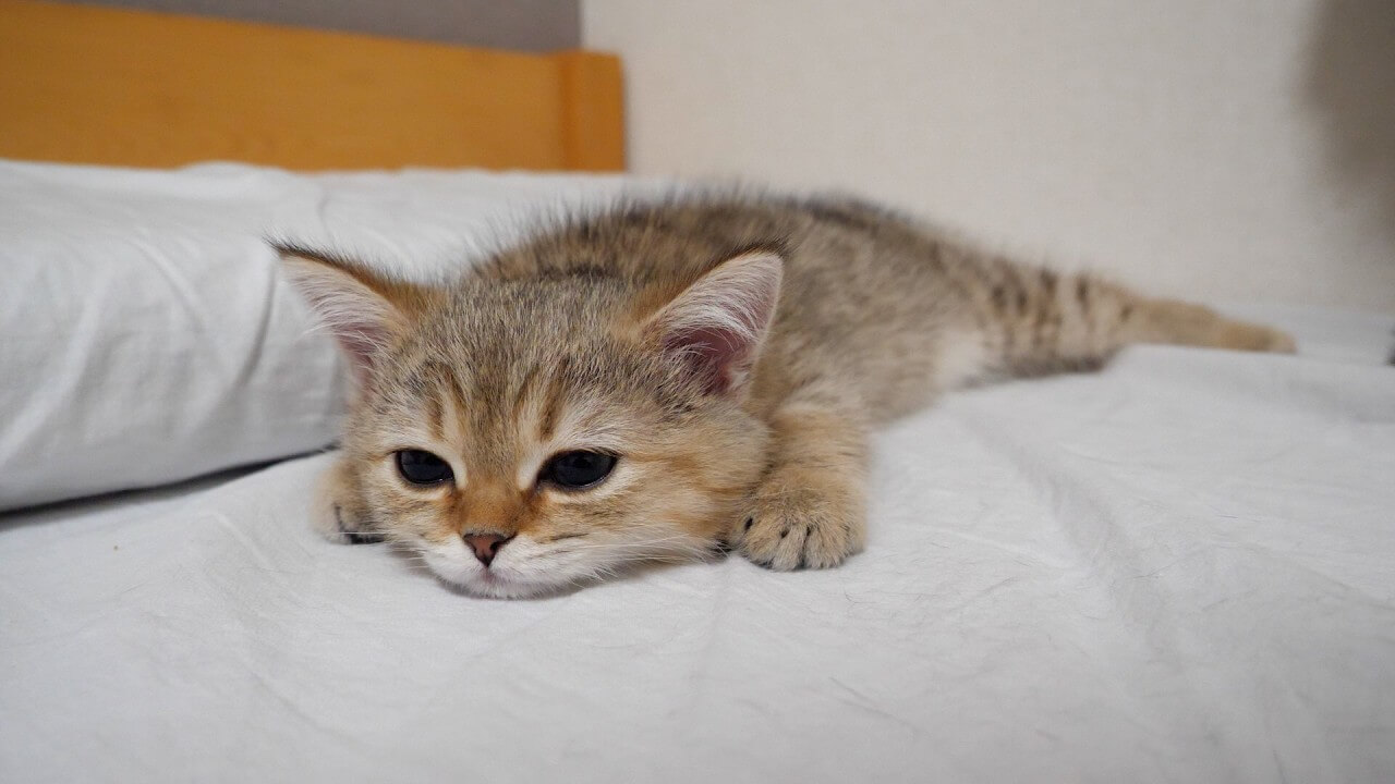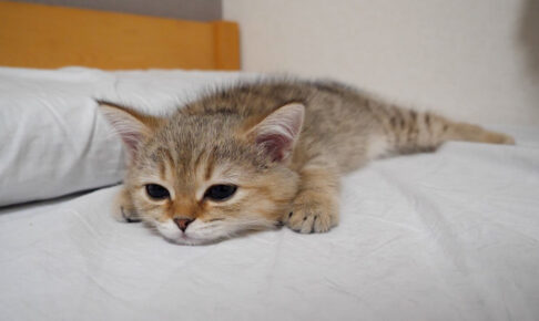 もう眠すぎて限界にゃ〜。ベッドの上でそのまま伸びたポーズになって寝落ちしてしまった子猫です。