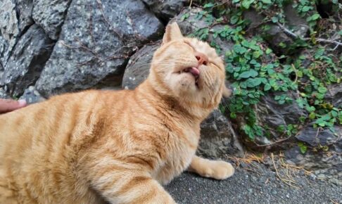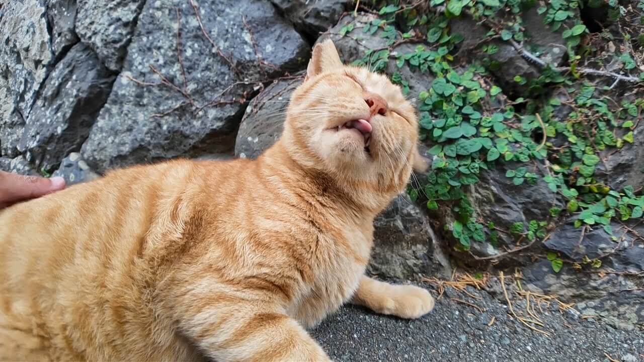 たくさん撫で撫でしてもらえてご機嫌になった猫さんは満足げな表情ながらも、もうちょっと撫でてもらいたそうにしています。