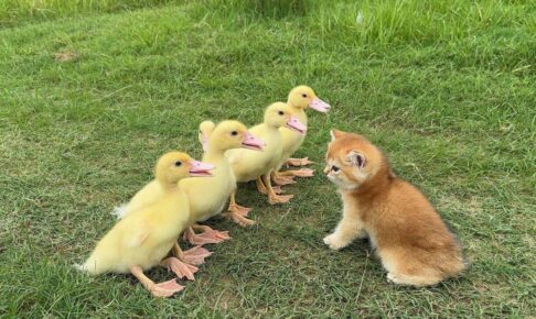 全速力で駆け出している子猫のあとを大急ぎでくっついていくアヒルの子達の慌てっぷりに思わずほっこりとしてしまいます。