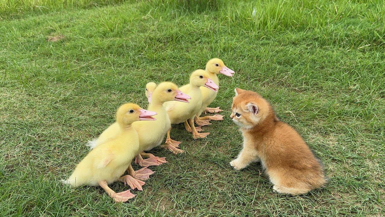 美しい緑地をブラウンの子猫が颯爽と駆け出します。するとその後ろからアヒルの子たちが6羽、一斉に追いかけています。