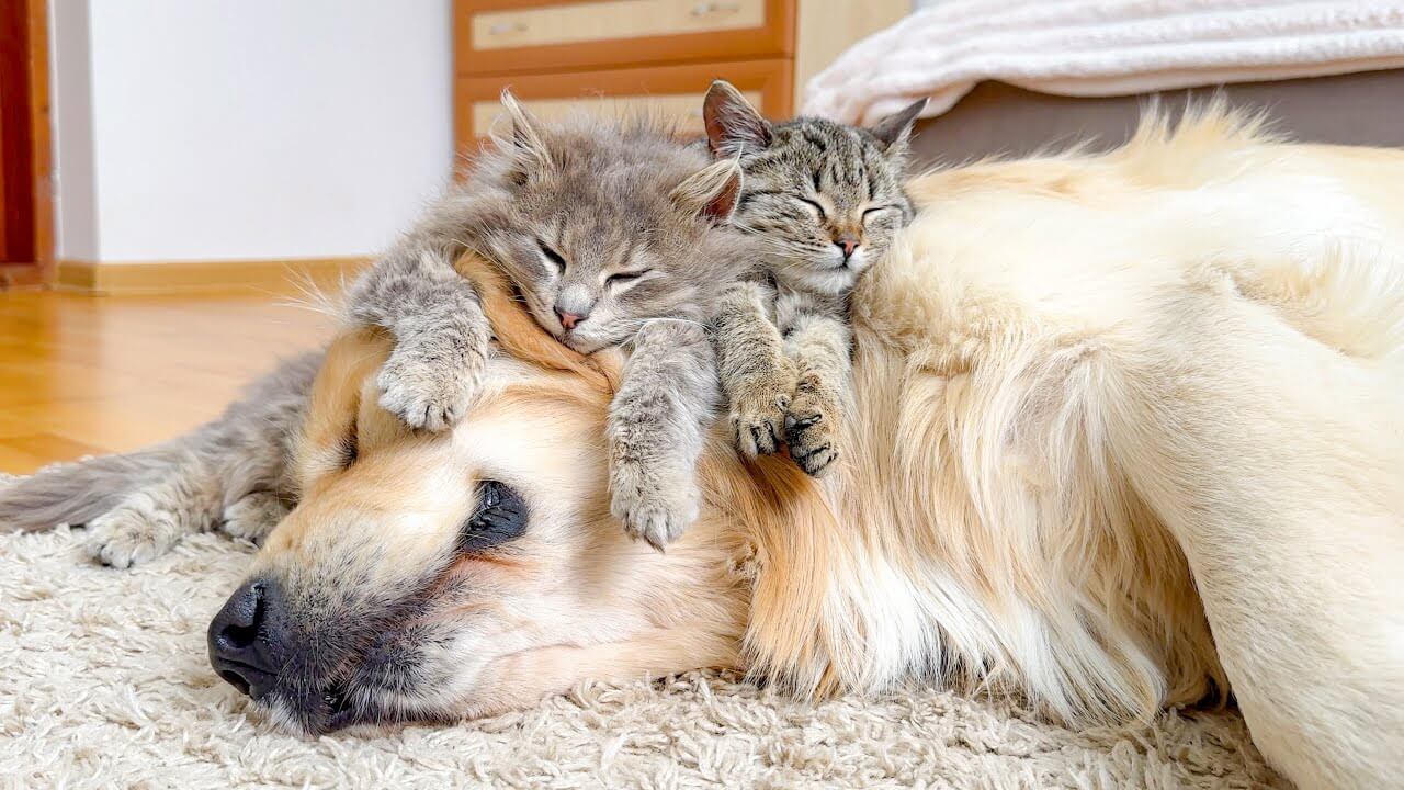 ゴールデンレトリバーのワンコにスリスリしている2匹の子猫たちは、心からワンコのことを信頼しているようです。