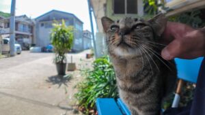 ベンチで寝ているキジトラ猫さんと癒しの時間を過ごします